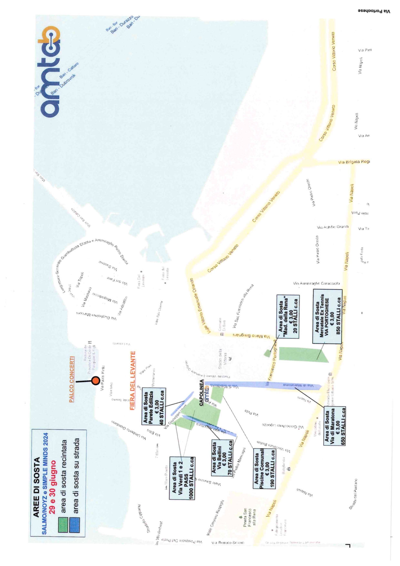 Per le giornate del 29 e del 30 giugno, in occasione dei concerti di di Salmo & Noyz Narcos e Simple Minds su via P. Pinto e piazzale Vittorio Emanuele III, le aree di sosta attrezzate sono: