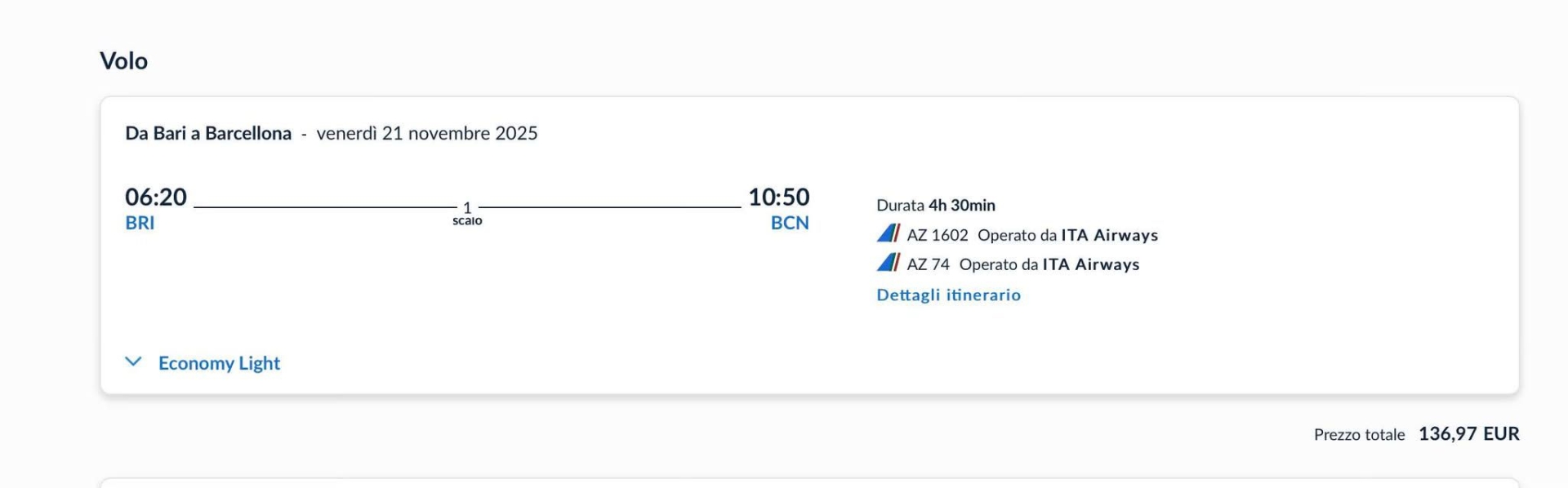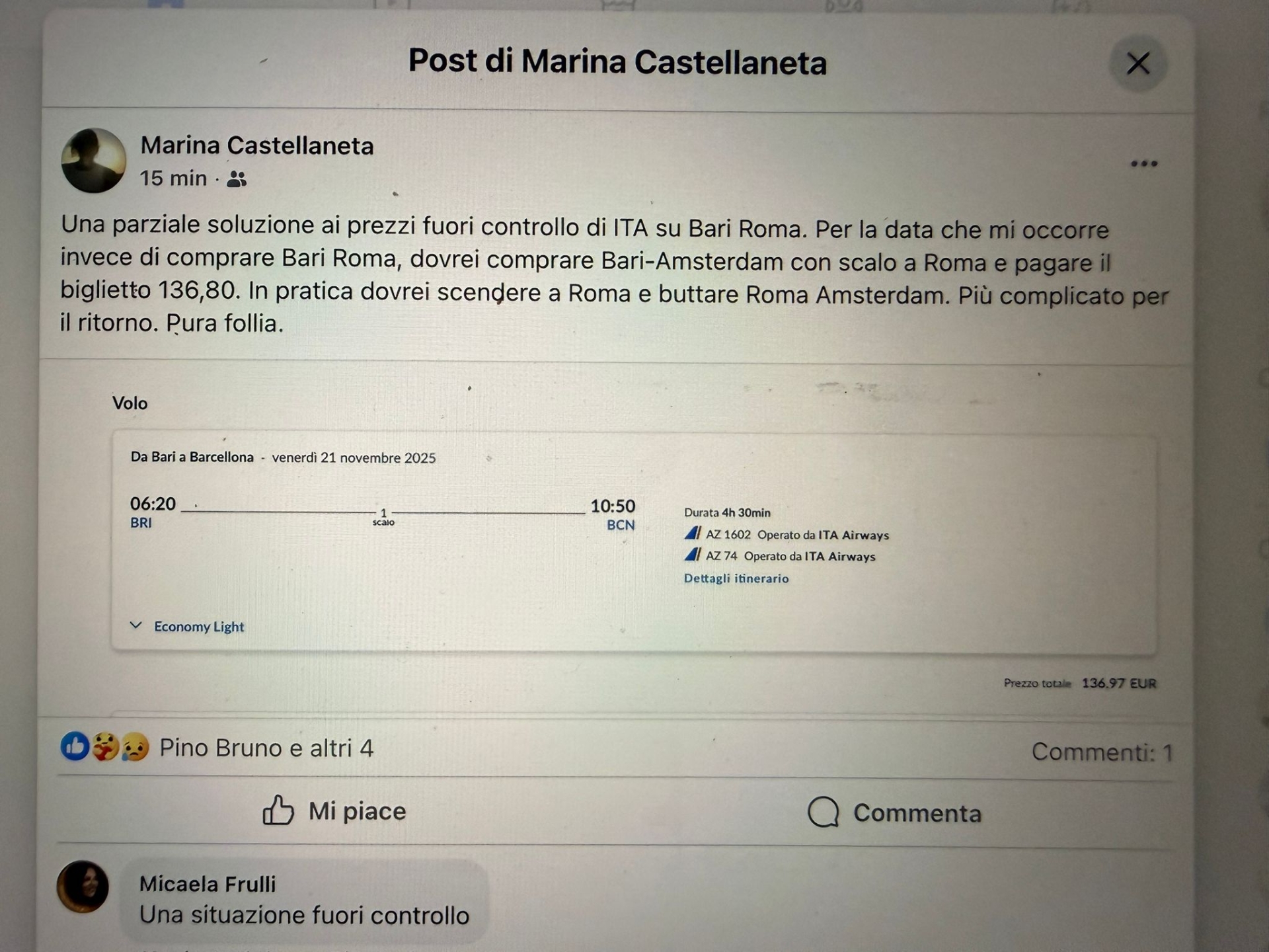 «In pratica costa meno acquistare un biglietto Bari–Amsterdam con scalo a Roma e pagare 136,80 euro… pura follia per arrivare nella Capitale», scrive Castellaneta, riferendosi a una soluzione alternativa per aggirare i costi. Stessa cosa vale se si prenota un volo diretto a Barcellona che fa scalo a Roma. Un modo "creativo" per risparmiare visto che i prezzi dei voli diretti sono intoccabili. In un secondo post infatti la docente barese evidenzia un biglietto andata e ritorno in economy di 50 minuti a ben 705,13 euro, definendo ironicamente la situazione “veramente conveniente”.