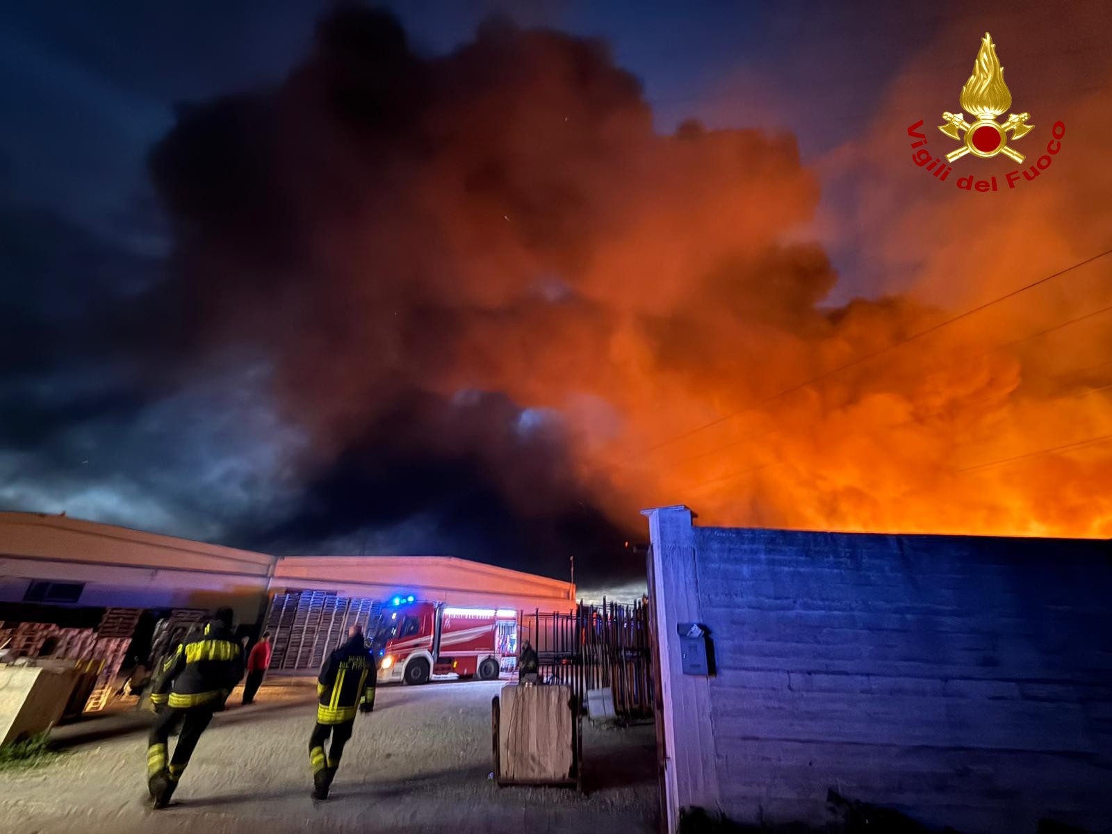 L'arrivo sul posto immediato di quattro squadre di vigili del fuoco ha incontrato una difficoltà aggiuntiva rappresentata da una linea di cavi di alta tensione caduta e rimasta a bloccare una delle strade di accesso al sito. I Vigili sono sono riusciti a circoscrivere e contenere l'incendio alla zona esterna interessando il capannone solo nella parte esterna. Non si registrano danni a persone.