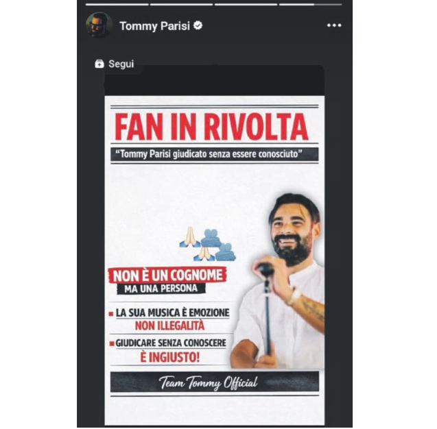 «Non è un cognome, ma una persona», scrivono i fan. «La sua musica è emozione, non illegalità. Giudicare senza conoscere è ingiusto». Un post comparso all’indomani della nutrita rassegna stampa sui lavori della Commissione antimafia in Prefettura pubblicata sempre nelle storie sui social del cantante. Una pagina attiva e aggiornata di frequente, gestita dal suo staff, su cui compare un numero di telefono a cui però non risponde nessuno.