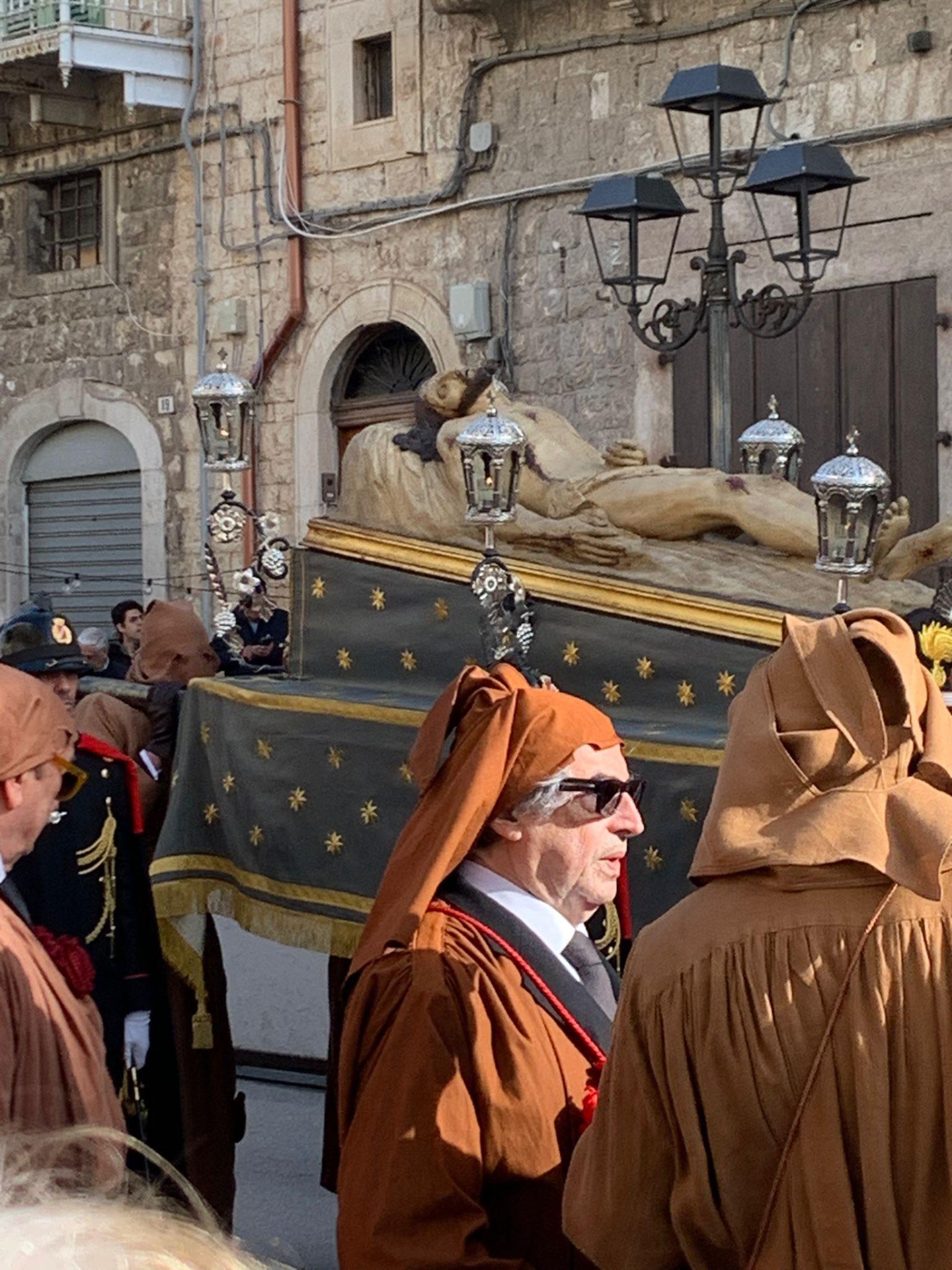 La pioggia ne ha però posticipato l’inizio e il corteo religioso si sta svolgendo oggi pomeriggio. Tanto lo stupore di chi assiste alla processione nel vedere un partecipante così famoso che «per la prima volta da confratello è in processione», dice chi assiste ogni anno alla processione.