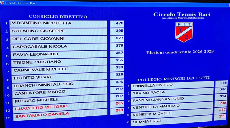 Nicoletta Virgintino è stata confermata alla presidenza del Circolo Tennis Bari per il terzo mandato consecutivo. La ex tennista ha battuto la sfidante Daniela Santamato, ottenendo 476 voti su 699 votanti, ed eleggendo in blocco gli 11 consiglieri della sua lista. Le operazioni di scrutinio concluse nella serata di lunedì 13 aprile hanno visto qualche momento di polemica tra i due schieramenti. Risultano eletti Giuseppe Solarino (395 voti), Giovanni Del Core (377), Nicola Capocasale (376), Leonardo Favia (357), Cristiano Trione (355), Michele Carnevale (330), Silvia Fiorito (329), Ninni Alessio Branchi (326), Marco Cantatore (297) e Michele Fusaro (287). Primi dei non eletti Vittorio Guaccero (285) e Daniela Santamato (280). Nel collegio dei revisori entrano Enrico D’Innella (386 voti), Paola Savino (386) e Giannantonio Pansini (314).