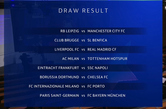 Il Milan affronterà il Tottenham negli ottavi di Champions League, come ha stabilito il sorteggio svoltosi a Nyon. Per l'Inter c'è il Porto. Tra i big match Liverpool - Real Madrid. Il Napoli sfiderà l'Eintracht Francoforte.