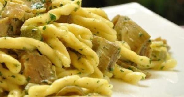 Ingredienti (dosi per 4 persone): 300 gr. di maccheroncini, un bicchiere di olio extravergine di oliva, una manciata di prezzemolo tritato, una manciata di capperi sotto sale, sei carciofi, quattro filetti d'acciuga, due spicchi d'aglio, un limone, un etto di olive nere snocciolate, sale e pepe q.b..