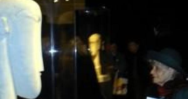 The exhibit features a series of elongated stone heads that bear a striking resemblance to archaic, oriental and tribal art in their simple, highly stylized form.