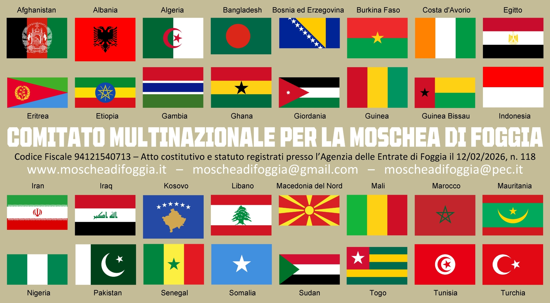 In occasione del Ramadan 2026, iniziato il 18 febbraio, la comunità musulmana di Foggia ha annunciato la nascita ufficiale del Comitato Multinazionale per la Moschea di Foggia, organismo costituito per promuovere la realizzazione di un luogo di culto pubblico, adeguato e riconosciuto.
