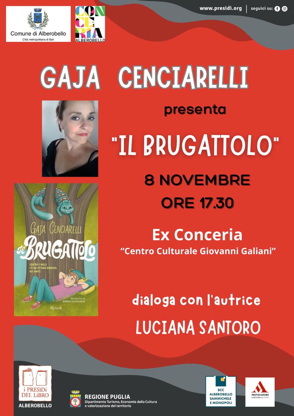 Sabato 8 novembre alle ore 17:30, il Centro Culturale Galiani – ex Conceria di Alberobello ospiterà Gaja Cenciarelli per un incontro dedicato alla lettura e alla crescita, in occasione della presentazione del suo primo romanzo per ragazzi, Il Brugattolo. L’autrice, per l’occasione, dialogherà con l’insegnante Luciana Santoro.