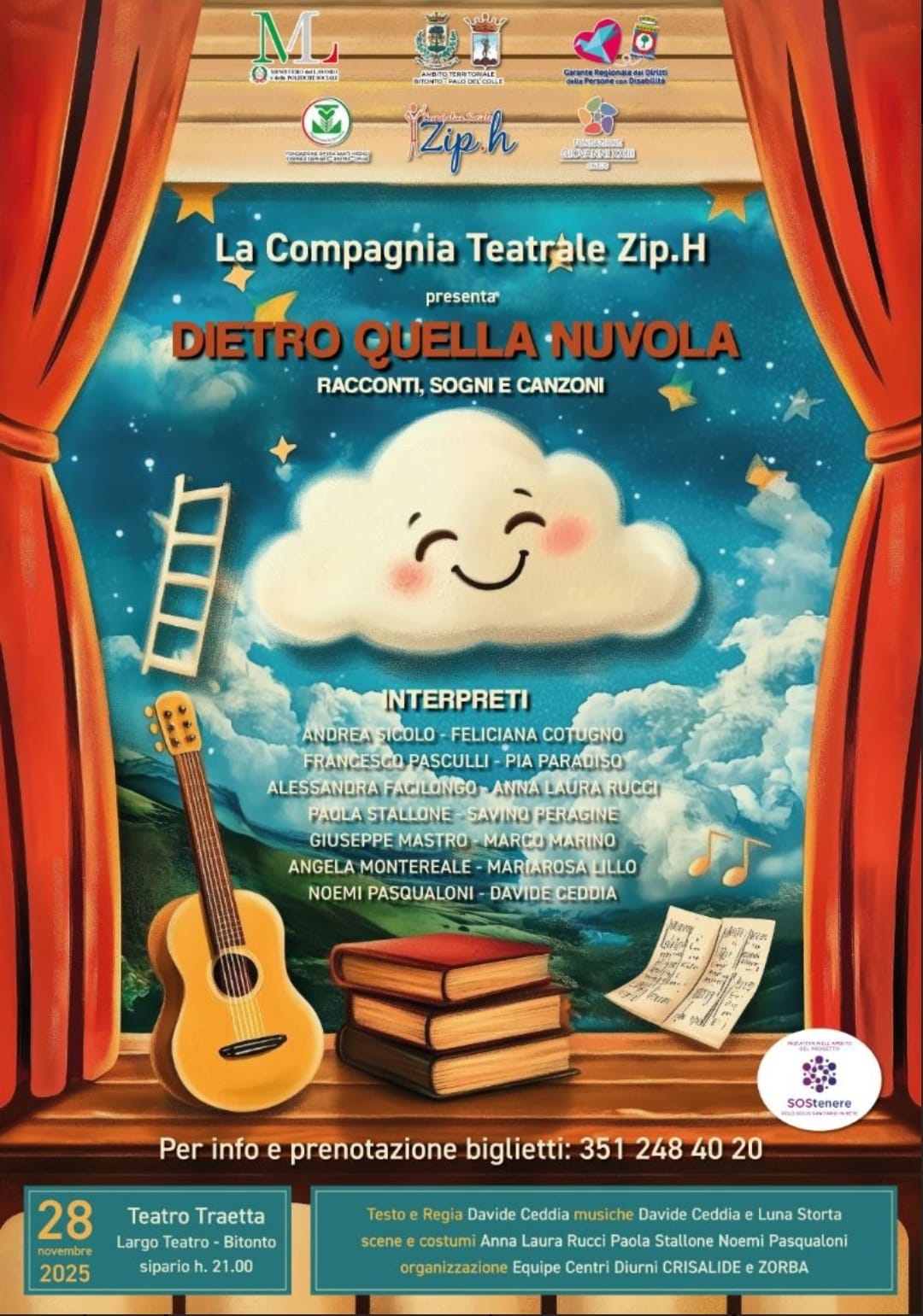 Venerdì 28 novembre alle ore 21 il Teatro Traetta di Bitonto ospiterà “Dietro quella nuvola”, la nuova commedia della Compagnia teatrale Zip.h diretta da Davide Ceddìa. Sul palco i ragazzi con disabilità e gli operatori dei Servizi diurni Zorba e Crisalide, protagonisti di uno spettacolo fatto di sogni, racconti, parodie e musica. L’iniziativa rientra nel Programma SOStenere promosso dal Comune di Bitonto insieme alla Fondazione Giovanni XXIII e alla Fondazione Santi Medici, con la partecipazione del Garante regionale dei Diritti delle Persone con Disabilità, Antonio Giampietro. La rappresentazione celebra creatività, inclusione e il potere del teatro come spazio di libertà e condivisione.