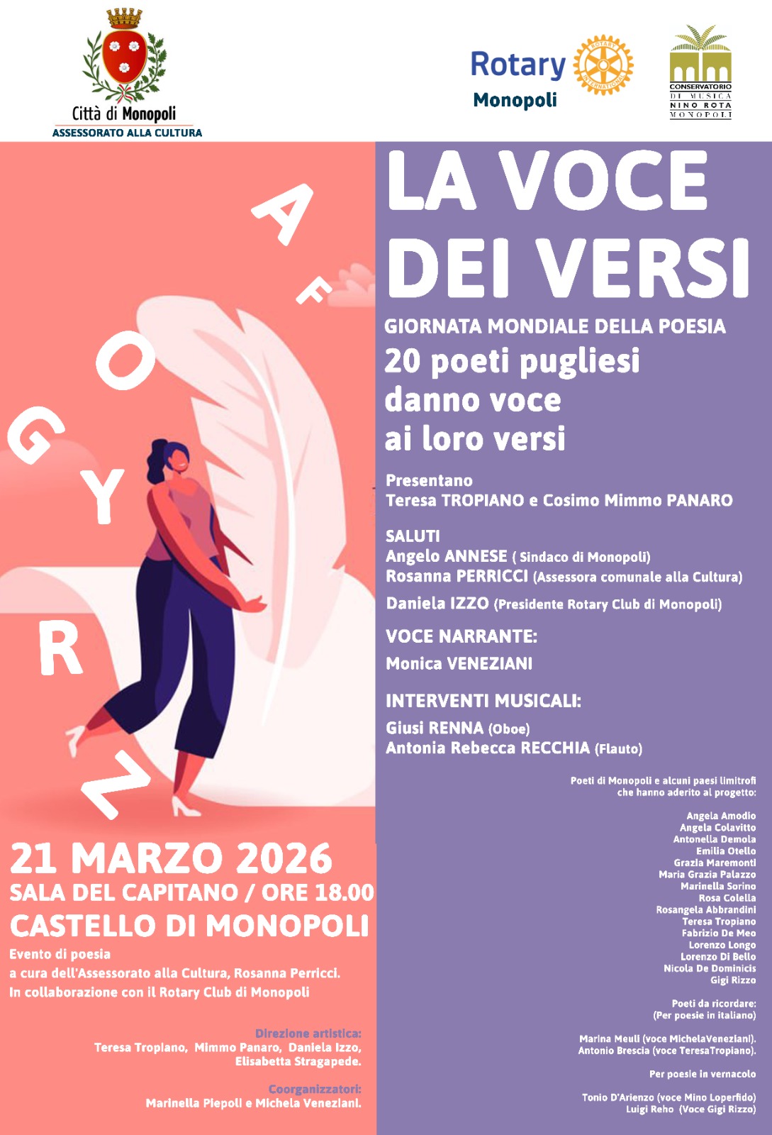 In occasione della Giornata Mondiale della Poesia, dedicata ad Alda Merini, il Castello Carlo V di Monopoli ospita una serata di poesia e musica, dal titolo La Voce dei Versi. Appuntamento sabato 21 marzo alle ore 18 nella Sala del Capitano il castello Carlo V Monopoli. Un reading poetico tra voci, emozioni e musica dal vivo, con artisti e giovani talenti. L'evento è a cura dell’Assessora alla Cultura Rosanna Perricci. Direzione artistica: Teresa Tropiano, Elisabetta Stragapede, Daniela Izzo, Cosimo Mimmo Panaro Ingresso libero fino a esaurimento posti.