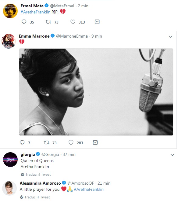 IL CORDOGLIO SOCIAL - Molti interpreti della musica italiana e internazionale in questi minuti stanno esprimendo il loro cordoglio via social per ricordare la cantante. Da Ermal Meta alla salentina Emma Marrone, che hanno pubblicato un cuore spezzato, a Giorgia, che ha postato una foto della "Queen of Queens", e alla leccese Alessandra Amoroso, che ha ricordato la Franklin con un estratto di uno dei suoi video più famosi, "I say a little prayer for you". Fuori dai confini della nostra regione, anche Noemi ha postato un messaggio di addio alla regina del soul con il videoclip della canzone "(You make me feel like a) Natural Woman". L'hashtag #ArethaFranklin è già balzato al primo posto dei trending topic di tutto il mondo.