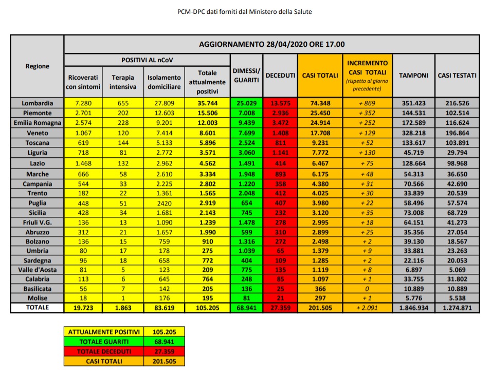 Il bollettino Coronavirus in Italia, diffuso dalla Protezione Civile, del 28 aprile 2020 conferma il proseguimento del calo dei malati (gli attualmente positivi): sono 105.205, 608 in meno rispetto a ieri. I casi totali (compresi decessi e guarigioni) salgono a 201.505, 2.091 in più registrati nelle ultime 24 ore. La quota dei guariti sale a 68.941, per un incremento di 2.317 unità. Il drammatico bilancio dei morti è arrivato a 27.359, 382 nelle ultime 24 ore.