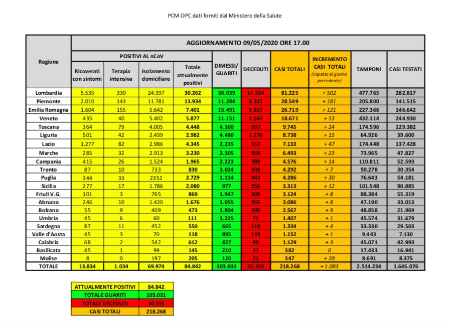 Sono 84.842 (-3.842) le persone attualmente positive al Covid-19 in Italia, 30.395 (+194) i decessi e 103.031 (+4.008) i guariti, per un totale di 218.268 (+1.083) casi: è quanto emerge dal consueto bollettino quotidiano diffuso dalla Protezione Civile inerente all’epidemia di Coronavirus nel nostro Paese. Dei 84.842 attualmente positivi, 13.834 (-802) sono ricoverati in ospedale, 1.034 (-134) necessitano di cure nei reparti di terapia intensiva, mentre 69.974 (-2.183) sono in isolamento domiciliare.
