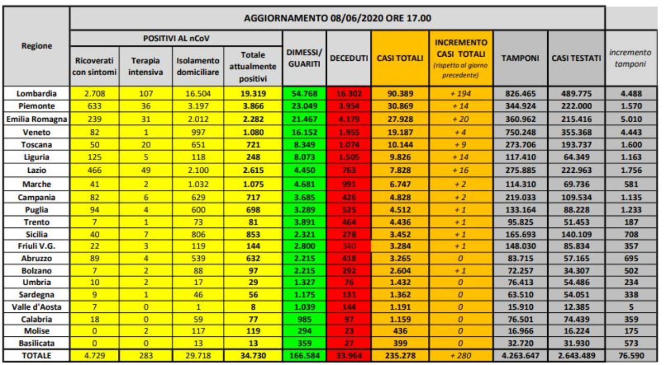 È di 34.730 persone attualmente positive (-532 rispetto a ieri), 33,964 decessi (+65) e 166.584 guariti (+747), per un totale di 235.278 casi (+280), il bilancio di oggi dell’epidemia di Coronavirus in Italia. Secondo il consueto bollettino diffuso dalla Protezione Civile, dei 34.730 attualmente positivi, 4.729 sono ricoverati in ospedale (-135), 283 necessitano di cure nei reparti di terapia intensiva (-4), mentre 29.718 si trovano in isolamento domiciliare (-393). Per quanto riguarda i tamponi, oggi sono stati realizzati 27112 test (ieri erano stati 49.478, l’altroieri 72.485). Il rapporto tra tamponi positivi e tamponi effettuati risale nuovamente: oggi è all’1 per cento (uno ogni 58 persone testate), ieri era stato dello 0,4 per cento (uno ogni 120 circa).