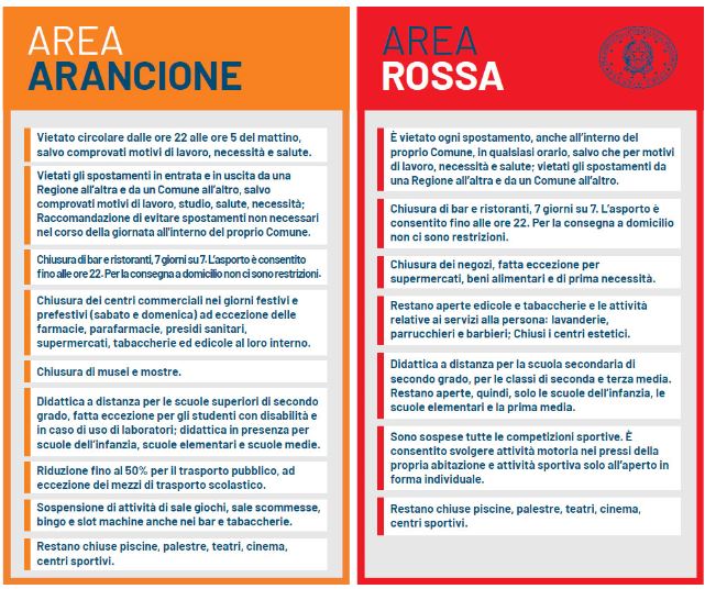 ATTIVITA' COMMERCIALI - Restano aperti anche nei giorni rossi gli alimentari, le farmacie e le parafarmacie, i tabaccai, le edicole, le librerie, i parrucchieri, le lavanderie. Chiusi i negozi di abbigliamento, le gioiellerie, i centri estetici, i centri commerciali (ad esclusione degli esercizi consentiti). Chiusi per tutto il giorno bar e ristoranti, ma sarà consentito prendere cibo da asporto; prevista la consegna a domicilio dalle 5 alle 22.