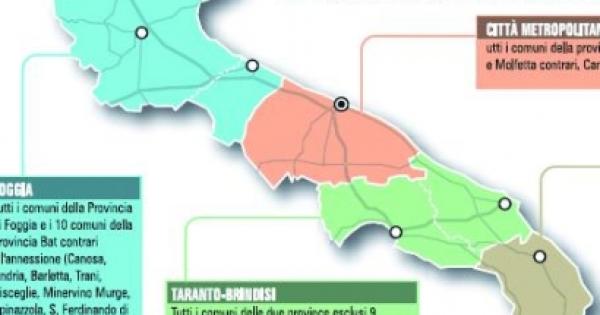 BARLETTA, ANDRIA, TRANI - Scrive nella sua relazione l’assessore regionale Marida Dentamaro: «I dieci comuni appartenenti alla sesta provincia, vale a dire, Barletta, Andria, Trani, Bisceglie, Canosa, Minervino, Spinazzola, Margherita di Savoia, Trinitapoli e San Ferdinando hanno trasmesso atti dei rispettivi consigli tendenti a provocare una iniziativa governativa che consenta la costituzione di una nuova provincia comprendente i territori della provincia Bat e quelli dei comuni eventualmente non aderenti alla costituenda città metropolitana di Bari». E poi: «Elemento comune in tutti gli atti, fra l’altro, è l’espressa volontà di non aderire alla provincia di Foggia, salvo che per San Ferdinando di Puglia». Risultato? Diametralmente opposto. Tutti i dieci comuni accorpati alla megaprovincia quasi regione di Foggia e Molfetta pure, che della città metropolitana di Bari non vuol neppure sentire parlare. «Macelleria istituzionale» ha detto l’altro giorno in aula il consigliere regionale Pd, Ruggiero Mennea.