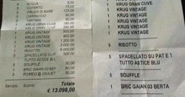 Già, il conto: 13.098,00 euro che, fatti un po’ di calcoli, equivale a poco più di 2.600 euro a testa. Va detto che i quattro olandesi, che stanno effettuando un raid in Mediterraneo a bordo della loro super imbarcazione, hanno cenato solo ed esclusivamente a base di astice e di champagne, quello più pregiato come può essere il «Krug vintage» che arriva a costare anche 3.000 euro a bottiglia. Loro, poi, ne hanno approfittato, rifornendo la cambusa del costoso vino, proprio come si conviene in un ambiente da jet set. Nessuna protesta per il conto. Anzi, come detto, ringraziamenti, qualche scambio di battuta con lo chef, Leonardo Vescera, e strette di mano prima di lasciare il raffinato locale sul porto viestano con la promessa di ritornarci presto, certamente prima della fine dell’estate.