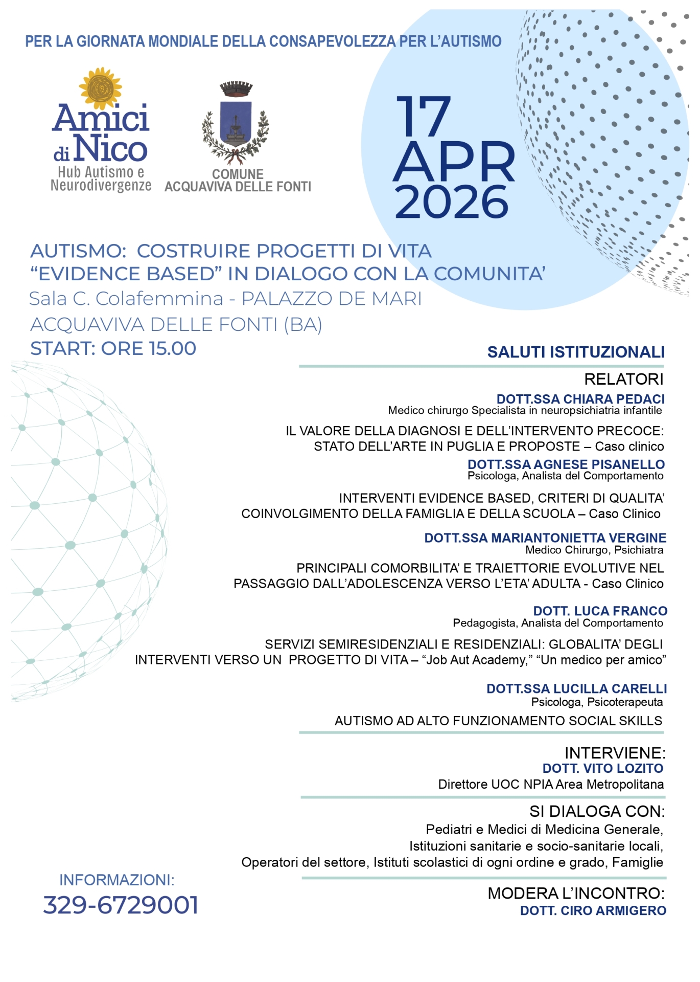 L’iniziativa, promossa dal Comune di Acquaviva delle Fonti e organizzata dall’associazione “Amici di Nico – Hub Autismo e Neurodivergenze”, si inserisce nelle attività legate alla Giornata mondiale della consapevolezza sull’autismo.