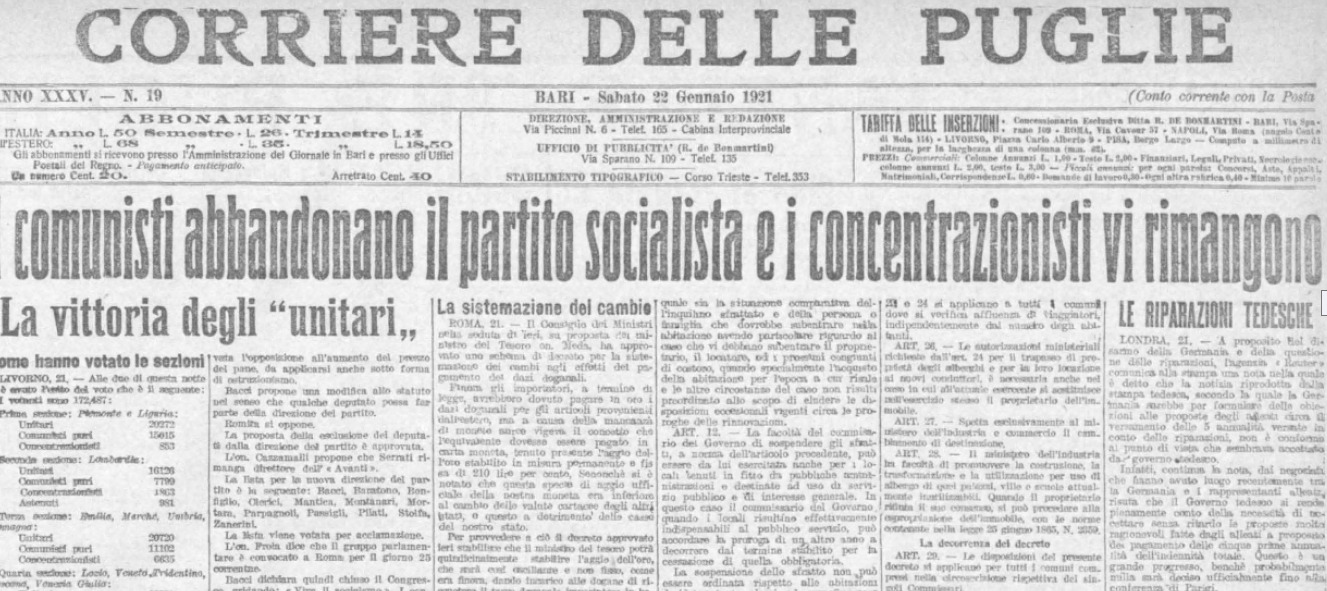 «I comunisti abbandonano il Partito socialista e i concentrazionisti vi rimangono»: così «Il Corriere delle Puglie» del 22 gennaio 1921 dà notizia della grande scissione avvenuta all’interno di una delle maggiori forze politiche del Paese, già da anni travagliata da profonde divisioni di corrente. Il giorno prima, nel Teatro Goldoni di Livorno si è concluso, infatti, il 17° Congresso nazionale del Partito socialista: è andata al voto la proposta di espellere i riformisti, o «unitari», che auspicavano una correzione del sistema attraverso le riforme e non necessariamente attraverso la rivoluzione. Questi, invece, hanno ottenuto la maggioranza dei suffragi: la fazione comunista, guidata dal napoletano Bordiga e di cui fanno parte anche Antonio Gramsci e Umberto Terracini – che a Torino avevano dato vita al settimanale «Ordine nuovo» – abbandona l’aula. «Ai comunisti che si separano da noi, noi diciamo che ci separiamo da essi con cordiale fraternità», sono le parole del socialista Bacci che compaiono sul «Corriere»; i congressisti escono, così, al canto dell’Internazionale, di Bandiera rossa e dell’Inno dei Lavoratori. Nel frattempo, nel Teatro San Marco di Livorno, si ufficializza la costituzione del Partito comunista d’Italia, sezione della Terza Internazionale: ai giornalisti, però, «è stato negato il permesso di assistere alla seduta».