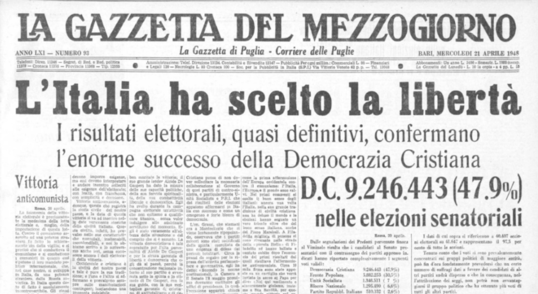 «L’Italia ha scelto la libertà» titola a caratteri cubitali la «Gazzetta» il 21 aprile, riportando i dati definitivi: la Dc ottiene il 48,5% e la maggioranza dei seggi, mentre il Fronte Popolare il 31%. Il voto in Puglia e Basilicata è abbastanza in linea con i risultati nazionali: picchi importanti in favore della Dc si registrano in particolare nell’area salentina. Una «vittoria anticomunista», la definisce in prima pagina Leonardo Azzarita: prenderà avvio, così, il quarto degli otto governi consecutivi guidati da Alcide De Gasperi. «La vittoria democristiana è tale soprattutto per l’alta personalità di De Gasperi e per la sicura garanzia di libertà e democrazia che egli dà al Paese, perché la concentrazione nazionale intorno al suo partito è avvenuta sotto la sua spinta e con la sua guida, la sua molteplice garanzia di crstiano, di antitotalitario e di democratico», conclude Azzarita.