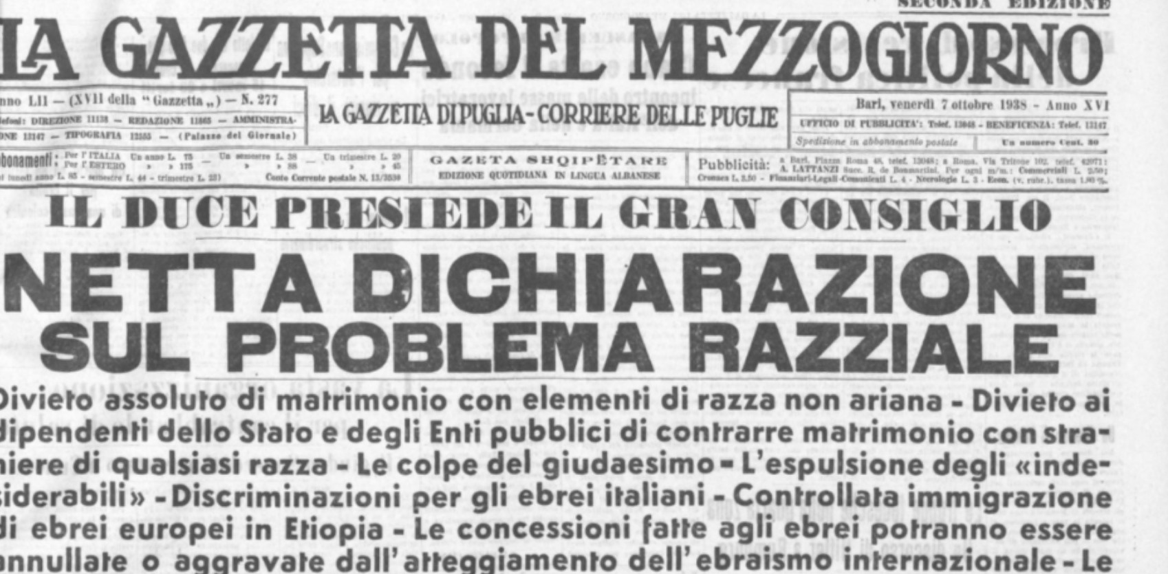 Il 7 ottobre 1938 l’edizione serale della «Gazzetta» riporta in prima pagina la Dichiarazione della razza, emessa dal Gran consiglio del fascismo. Si tratta dell’atto ufficiale che avvia la persecuzione antisemita e razzista da parte del regime, già preparata da una violenta propaganda. Nell’agosto sul primo numero della rivista «La difesa della razza» – diretta da Telesio Interlandi e voluta da Mussolini in persona – è stato pubblicato il “Manifesto degli scienziati razzisti”. Nelle settimane successive, dopo l’istituzione della Direzione generale per la demografia e la razza, viene avviato il censimento della popolazione semita in Italia. Esito di questo drammatico processo è, dunque, l’approvazione delle cosiddette “Leggi razziali”, provvedimenti che sanciscono l’esclusione degli ebrei dalla vita nazionale: espulsione dalle scuole, dagli enti pubblici e privati, allontanamento dal territorio nazionale degli israeliti stranieri. La Dichiarazione della razza, si apprende dal quotidiano, vieta «i matrimoni di italiani con appartenenti alle razze camita, semita o comunque non ariana» e impedisce agli ebrei di «essere possessori o dirigenti di aziende, di qualsiasi natura, che impieghino cento o più persone; essere possessori di oltre cinquanta ettari di terreno; prestare servizio militare in pace e in guerra». Gli italiani di religione ebraica sono costretti, così, a uno stato di inferiorità legale e civile, preludio alle persecuzioni degli anni successivi. La svolta tragica avverrà, infatti, nel 1943, quando la Repubblica Sociale Italiana sancirà l’arresto sistematico, la confisca dei beni, l’allestimento di campi di transito e di concentramento su suolo italiano, affiancando i nazisti nei rastrellamenti, nelle persecuzioni e nello sterminio degli ebrei.
