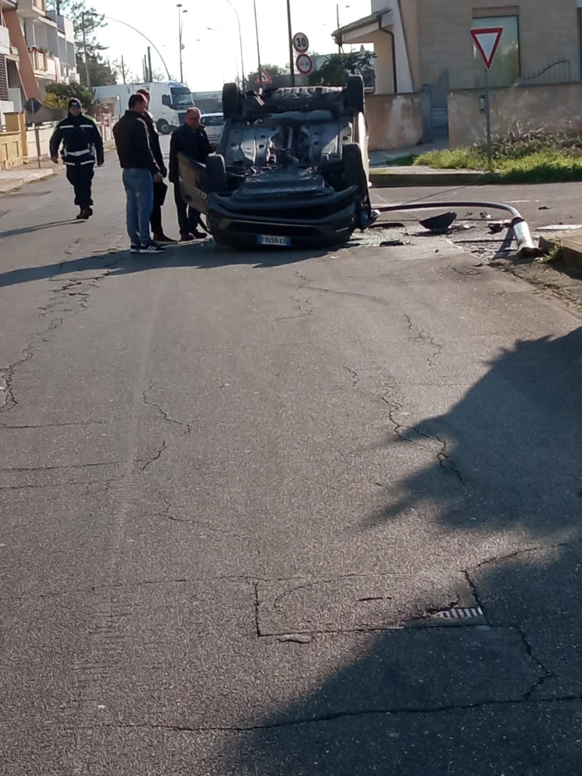 ALLISTE - Spettacolare incidente, per fortuna senza gravi conseguenze, questa mattina ad Alliste, in provincia di Lecce. Intorno alle 9 un giovane di 26 anni, mentre era alla guida di una utilitaria presa a noleggio, ha perso il controllo del mezzo sulla via per Felline ed è andato a sbattere contro un palo prima di capovolgersi.