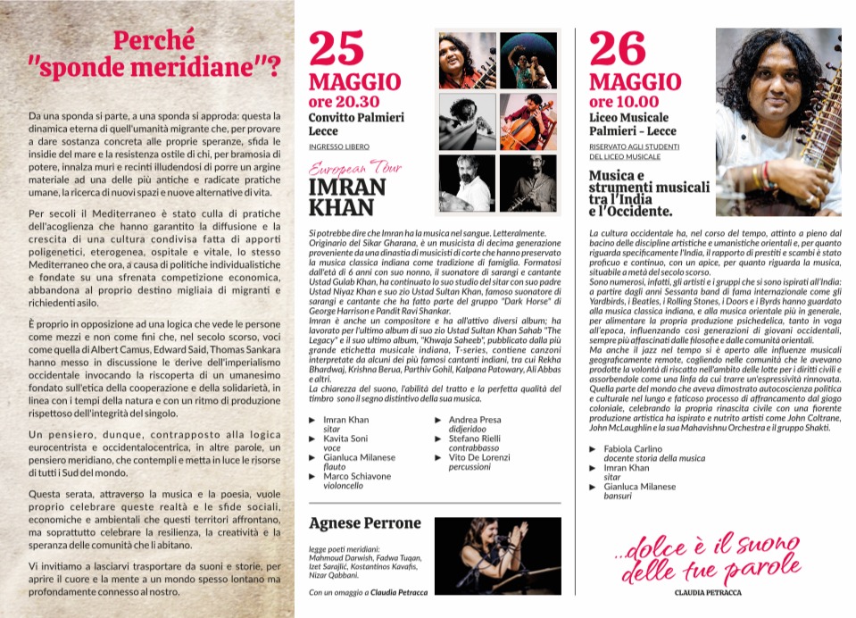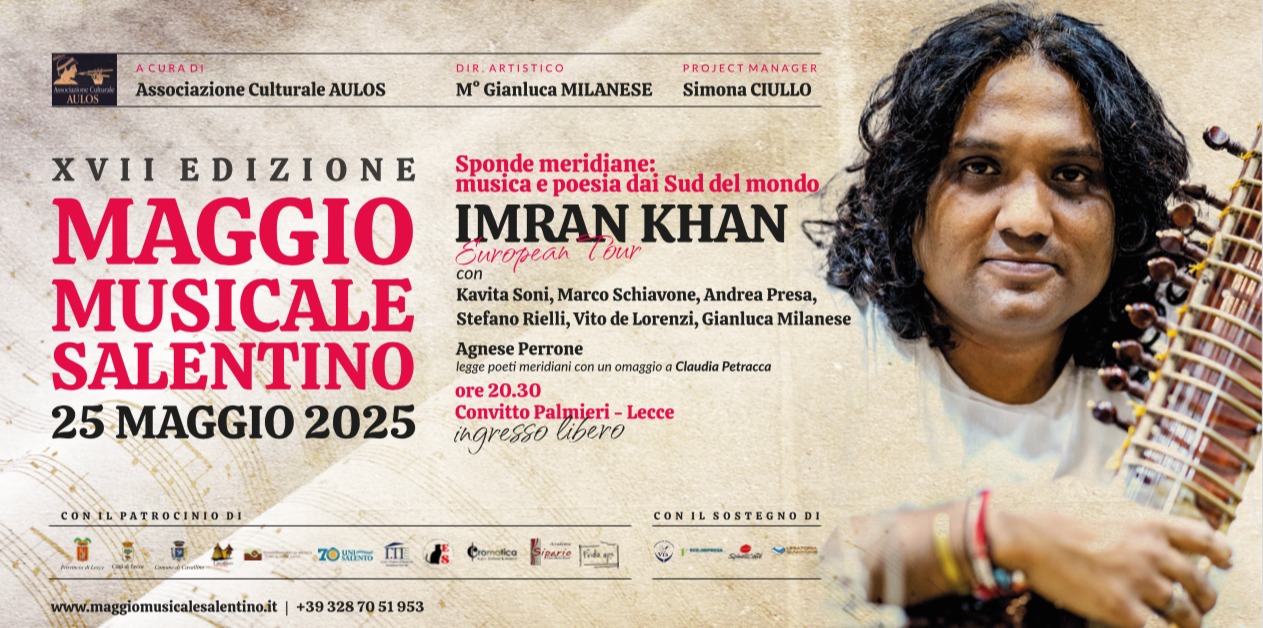 Voci che parlano di esilio, amore, identità, guerra, nostalgia, libertà. In chiusura, un omaggio speciale a Claudia Petracca, figura significativa per il territorio, intellettuale e attivista che ha incarnato in pieno lo spirito dell’umanesimo meridiano. Seguirà poi il 26 maggio un appuntamento al Liceo Palmieri di Lecce, riservato agli studenti, con un approfondimento sulla musica e gli strumenti musicali tra l'India e l'Occidente.