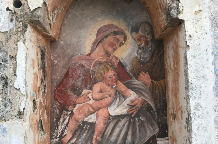 oltre le colonne Al di là del cancello d’ingresso retto da due colonne nelle cui nicchie sono altrettanti affreschi a soggetto religioso, s’erge dunque l’imponente costruzione risalente almeno al 1192, all’epoca del signore-feudatario Maurizio Falcone. Lungo quattro lati di 75 e 50 metri per parte, corrono le mura spesse due metri e mezzo, ai lati delle quali sono rimaste due delle quattro Torri che gli conferivano l’aspetto del Castello-recinto e la forma quadrangolare.