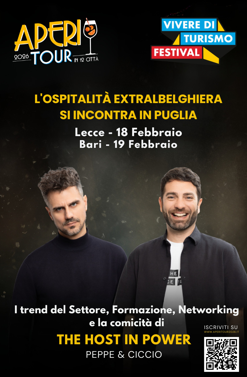 Aperitour 2026, in programma a Lecce, presso le Officine Cantelmo, il 18 febbraio a partire dalle ore 17.00 (iscrizioni al link www.aperitour2026.it), è un evento imperdibile per chi opera quotidianamente nel settore dell’ospitalità e sceglie di non fermarsi: strategie operative, letture dei trend di mercato, visioni evolutive e strumenti pratici utili a migliorare il proprio posizionamento professionale e la qualità dei servizi offerti. Il giorno dopo, il 19 febbraio, il format fa tappa anche a Bari.