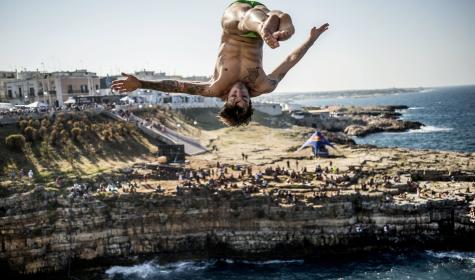 Una scogliera altissima che, a picco sul mare, dà brividi e vertigini solo a vederla: bellissima e inquietante al tempo stesso. È da qui che ogni luglio si tiene il più famoso campionato di tuffi, lo spettacolo irripetibile del «Red Bull Cliff Diving». L’1 e il 2 luglio 2023 i migliori high diver del mondo si sono sfidati nelle acque limpide di Polignano, turchesi e profonde, richiamando una marea di appassionati. Decima edizione di grande successo, con 24 atleti nell’iconico scenario, reso unico e inimitabile per via delle minute abitazioni posizionate a picco sulle scogliere.