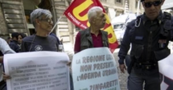 Un momento della protesta dell'Usb: che con lo striscione "Non è difficile: lavoro ai giovani, pensioni agli anziani" grida slogan come "Renzi a casa", "venduti" all'esterno della sede del Minister del Lavoro a Roma, 14 Giugno 2016. ANSA/MASSIMO PERCOSSI