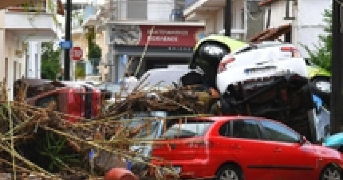 epa05528579 Piled up vehicles are seen in a street after a flood in Kalamata, Greece, 07 September 2016. Three people are reported dead in Kalamata and one woman is missing in Thessaloniki, after heavy rain in several towns in Greece. EPA/NIKITAS KOTSIARIS