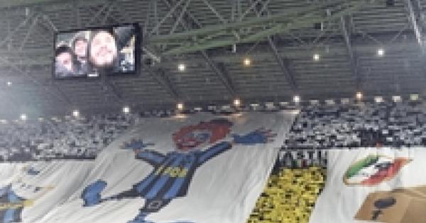 TORINO, 28 FEB - Curva sud coperta da giganteschi teli di sfottò all'Inter ed ai suoi tifosi allo 'Stadium' prima dell'inizio di Juve-Inter. I gruppi del tifo organizzato bianconero hanno esposto un enorme pagliaccio nerazzurro con tanto di maglia con l'anno di fondazione (1908) dell'Inter tra altri due teli, l'uno con il disegno di una tenda circense e l'insegna 'Cirque du carton' l'altro con uno scudetto contrassegnato dal numero 14 ma con la scritta fac-simile che esce da una scatola a molla per le sorprese.