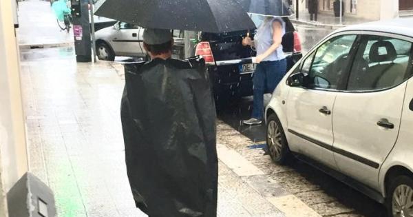 MONOPOLI - Tanto tuonò che piovve anche dalla Capitale in giù. Ai fulmini e ai temporali improvvisi che hanno caratterizzato il pomeriggio di ieri, non sono mancate le soluzioni estemporanee e creative di chi è stato colto impreparato. Allora, quando l’ombrello non si dimostra sufficiente, ecco l’improvvisato impermeabile realizzato con un sacco della spazzatura. Che non si tratti di un uomo da buttare rimarrà un mistero.