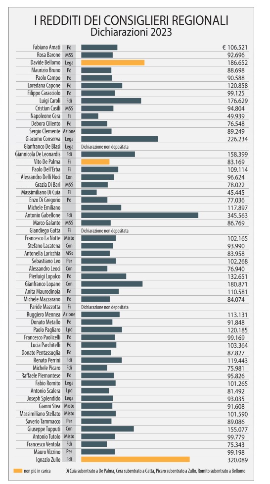 Veniamo ai numeri. Il più ricco del Consiglio regionale è Antonio Gabellone, 64 anni, di Gallipoli, con un reddito lordo 2022 di 345mila euro. La cifra si spiega con il fatto che l’ex presidente della Provincia di Lecce è farmacista, e dunque somma al compenso di consigliere regionale anche 232mila euro di redditi di impresa provenienti dall’attività privata. Dietro Gabellone c’è un altro ex come Ignazio Zullo, che a settembre 2022 è stato eletto senatore: 320mila euro, anche in questo caso spiegabili con la somma tra l’indennità di consigliere e 241mila euro di proventi da attività professionale (ex medico Asl, Zullo è ora autonomo e si occupa di medicina del lavoro). Al terzo posto c’è Giacomo Conserva, della Lega, avvocato, con 226mila euro: l’attività professionale ha prodotto 145mila euro di reddito.