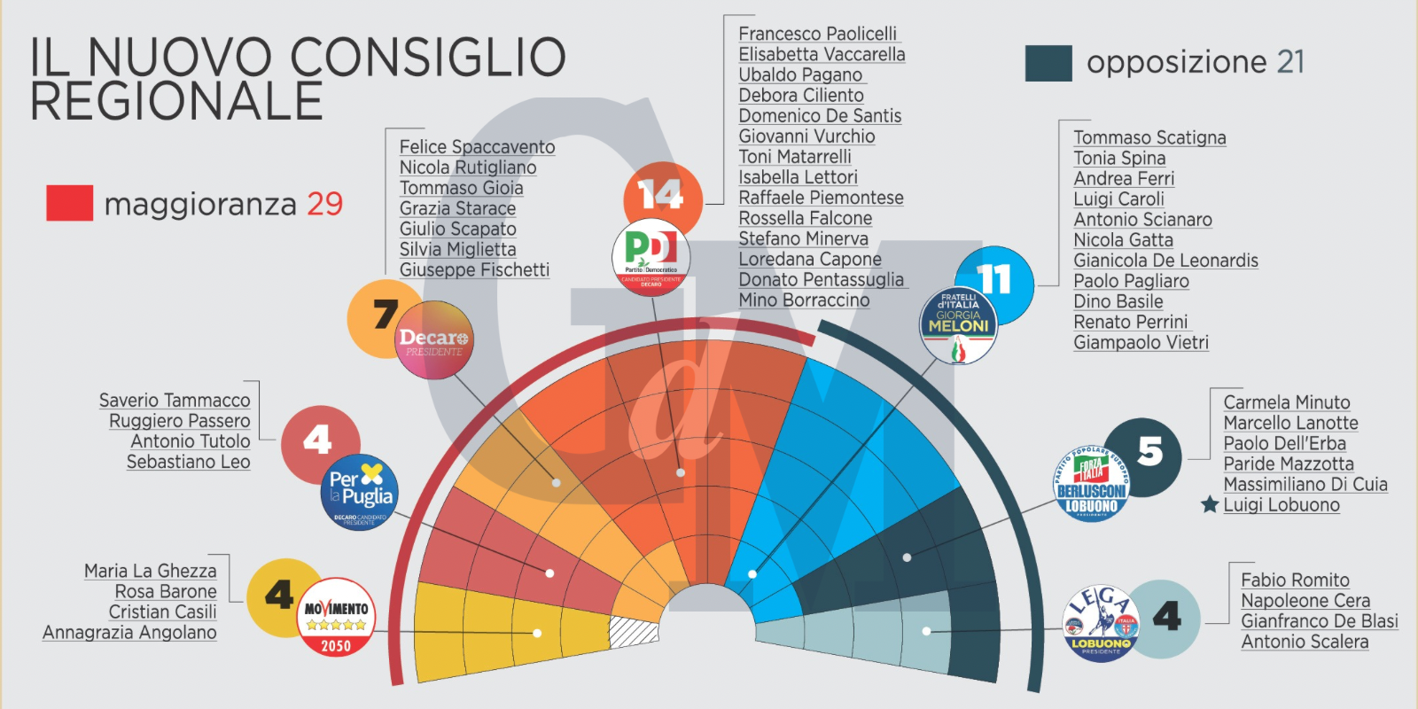Per quello che riguarda l’opposizione, Fratelli d’Italia ottiene due seggi in ogni provincia (Spina e Ferri nella Bat, Caroli e Scianaro a Brindisi, Gatta e De Leonardis a Foggia, Pagliaro e Basile a Lecce, Perrini e Vietri a Taranto) tranne in quella dove è andata meglio cioè Bari (entra Scatigna). Forza Italia è rappresentata a Bari (Minuto), Foggia (Dell’Erba), Bat (Lanotte) e Lecce (Mazzotta) e Taranto (Di Cuia). Chiude la Lega con Romito a Bari, Cera a Foggia, De Blasi a Lecce e Scalera a Taranto (il seggio «perso» per il candidato presidente sconfitto era nella Bat).