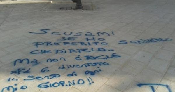 "Scusami se ho preferito scriverti che dirtelo...", così inizia uno dei messaggi scritti a caratteri cubitali e con spray azzurro. Un modo a dir poco incivile quello di servirsi di luoghi pubblici per corrispondere con la propria amata. Eppure nell'epoca degli sms questo dovrebbe facilitare le cose. A meno che non abbia voluto far sapere a tutto il rione le sue intenzioni. E a scrivere, qui il colmo, una ragazza (o donna) che scrive "Ti odio, ma sono pazza di te" e poi "Sarai mio". Intenzioni, dalle scritte, bellicose a quanto pare. Ma, resta il fatto che è un gesto deprecabile, incivile e che ha danneggiato la pavimentazione recentemente sistemate con le tipiche chianche.