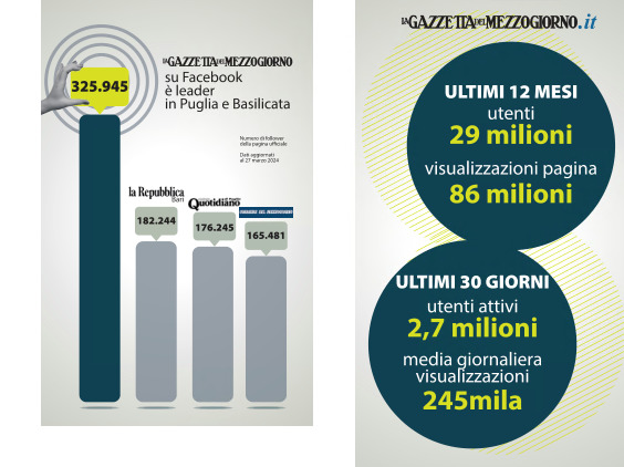 Senza dimenticare l’interazione costante con i social: Facebook, Twitter, Instagram, LinkedIn, YouTube, Whatsapp e Telegram. Canali che ci permettono di mantenere un contatto diretto e che ci incoronano leader nel territorio grazie ai nostri 325.945 follower su Facebook. Numeri che ci inorgogliscono e che dimostrano quanto l’informazione di qualità della «Gazzetta» sia premiata e seguita non solo in Puglia e in Basilicata. Sono milioni, infatti, gli utenti che scelgono il nostro sito per rimanere in contatto dal resto d’Italia: i lettori di Milano, Roma, Genova e Napoli costituiscono una fetta importante del nostro pubblico.