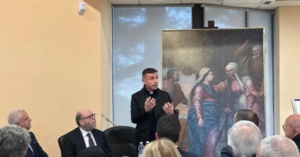 L’AQUILA (ITALPRESS) – La Banca del Fucino, da sempre legata all’Abruzzo, ha presentato oggi a L’Aquila il restauro de La Visitazione, splendida pala d’altare della Chiesa di San Francesco di Paola. La grande tela, che misura quasi 3 m², è datata 1725 – celebrando quindi i suoi 300 anni – ed è firmata dal pittore milanese Bernardo Strada. L’opera raffigura l’incontro tra la Vergine Maria e Sant’Elisabetta e fu originariamente commissionata dalla Corporazione dei Sarti – che nella chiesa deteneva un proprio altare e organizzava la vita religiosa dei suoi membri – testimoniando una pagina importante della storia sociale e spirituale della città. Il restauro, condotto a regola d’arte nei mesi scorsi, ha riportato l’opera al suo splendore originario. La tela non era stata colpita direttamente dal sisma del 2009, ma risultava gravemente compromessa dall’alterazione delle vernici, dalla perdita di tensione e da evidenti deformazioni. L’inaugurazione si è svolta alla presenza dell’Assessore del Comune dell’Aquila, Ersilia Lancia. Sono intervenuti Don Luigi Maria Epicoco, Parroco della Chiesa; Luca Bergamotto, Consigliere di Amministrazione della Banca del Fucino; Vladimiro Giacchè, Direttore Comunicazione, Studi e Innovazione Digitale della Banca del Fucino; Gianluigi Simone, storico dell’arte dell’Arcidiocesi dell’Aquila; la restauratrice Valentina Muzii e Roberto Bellomi, Area Manager Abruzzo della Banca del Fucino. “Il terremoto ha colpito duramente la nostra comunità e il patrimonio artistico de L’Aquila, che custodisce una parte fondamentale della nostra identità. Grazie al sostegno della Banca del Fucino, abbiamo potuto riportare alla luce la tela della Visitazione, posta sull’altare maggiore della chiesa. Restituire bellezza significa restituire umanità: è un gesto che infonde fiducia e apre alla speranza. Ritrovare quest’opera nel suo splendore è per tutti noi motivo di profonda gioia”, ha dichiarato Don Luigi Maria Epicoco, Parroco della Chiesa. “Questo restauro rappresenta un gesto di responsabilità verso una città con cui la Banca del Fucino condivide una storia lunga e profonda. Restituire alla comunità un’opera così significativa significa preservare un frammento della sua memoria e della sua identità. La cultura è un patrimonio che unisce e che crea valore nel tempo: contribuire alla tutela di questi beni è parte del nostro impegno quotidiano nei confronti dei territori in cui la Banca opera”, ha affermato Luca Bergamotto, Consigliere di Amministrazione della Banca del Fucino. “E’ per noi un onore aver contribuito alla rinascita di quest’opera, un vero tesoro artistico della città. L’iniziativa, sostenuta dalla Banca del Fucino, rappresenta un segno concreto di vicinanza alla comunità aquilana e al suo patrimonio spirituale. Si inserisce tra gli impegni che promuoviamo a livello nazionale per essere un punto di riferimento per i territori e continuare a svolgere, concretamente, il ruolo di banca del territorio”, ha affermato Roberto Bellomi, Area Manager Abruzzo e Marche della Banca del Fucino. In attesa del completamento dei lavori di restauro della Chiesa di San Francesco di Paola, la pala d’altare verrà ospitata temporaneamente nella Filiale della Banca del Fucino, dove potrà essere ammirata dal pubblico. Nei prossimi mesi, l’opera verrà restituita alla comunità parrocchiale e tornerà ad arricchire la sua sede originaria. – foto ufficio stampa Banca del Fucino – (ITALPRESS).