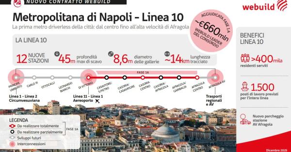 MILANO (ITALPRESS) – Webuild, in consorzio, ha vinto un contratto da circa 660 milioni di euro di valore totale per la realizzazione di una prima tratta del Lotto 1 della nuova Linea 10 della metropolitana di Napoli. Il lotto è parte di un più ampio progetto che prevede un investimento complessivo stimato di oltre 3,1 miliardi di euro, destinato a rivoluzionare la mobilità nell’area nord-orientale della città. La Linea 10 sarà driverless e permetterà a regime ad oltre 400.000 cittadini di usufruire di un collegamento rapido e sostenibile con il centro città e con la rete dell’alta velocità ferroviaria. “Con questa nuova aggiudicazione Webuild, alla guida del consorzio che realizzerà il Lotto 1 della Linea 10 – si legge in una nota -, rafforza il suo ruolo nello sviluppo delle infrastrutture strategiche del Sud Italia dove sta realizzando 19 progetti per un valore complessivo aggiudicato di oltre 15 miliardi di euro, che danno occupazione a 8.700 persone, tra diretti e terzi (dato al 30 giugno 2025), con 7.600 fornitori diretti coinvolti da inizio lavori”. “Con oltre 890 km di metropolitane costruite nel mondo, Webuild si conferma leader globale nelle infrastrutture complesse per la mobilità urbana – prosegue la nota del gruppo -. In Italia, il Gruppo continua a trasformare il volto delle grandi città: a Napoli sono 21 le stazioni realizzate o in corso, comprese alcune delle iconiche “Stazioni dell’Arte”, mentre a Milano ha costruito la M4 che permette di collegare in soli 12 minuti il centro all’aeroporto di Linate. A Roma, sono state di recente inaugurate le archeostazioni Colosseo/Fori Imperiali e Porta Metronia sulla Linea C: la prima tratta driverless della Capitale che, grazie al recupero dei reperti archeologici emersi durante gli scavi, coniuga innovazione infrastrutturale e valorizzazione del patrimonio culturale”. Il maxi-progetto della Linea 10 della metro di Napoli, realizzato in sinergia tra Comune di Napoli e Regione Campania (con EAV in qualità di soggetto attuatore), è tra le opere più strategiche per la mobilità sostenibile del Mezzogiorno e permetterà di collegare il centro della città con la stazione AV Napoli-Afragola, già realizzata dal Gruppo Webuild, destinata a diventare hub strategico per il collegamento tra Nord e Sud Italia e tra il sistema di trasporti regionale e nazionale. Il Lotto 1 riguarda la progettazione esecutiva e la realizzazione delle opere civili della Linea 10 che saranno eseguite per fasi. L’appalto prevede infatti circa 660 milioni di euro, già aggiudicati, per la realizzazione di una prima tratta di 6,5 km (Fase 1A) e il diritto in esclusiva a realizzare ulteriori opere, in attesa di finanziamento, fino ad un valore totale di oltre 1,7 miliardi per il futuro completamento della linea. Per la realizzazione dei lavori della Fase 1A si stima saranno creati fino a 700 posti di lavoro, tra personale diretto e di terzi, che potranno arrivare fino a 1.500 con il futuro completamento dell’opera. Il consorzio che si è aggiudicato i lavori è composto, oltre che da Webuild, da Eteria Consorzio Stabile, Costruire, ICM e M.N. Metropolitana di Napoli. Il tracciato della Linea 10, lungo complessivamente circa 14 km dalla Stazione AV Napoli-Afragola fino alla Stazione Principe Umberto, sarà realizzato quasi interamente in sotterraneo, con gallerie scavate in parte con metodo tradizionale e in parte con l’impiego di TBM (Tunnel Boring Machine). Nell’ambito dell’appalto, i lavori della Fase 1A attraverseranno i comuni di Afragola, Casoria, Casavatore e Napoli, con 7 stazioni di cui 3 da realizzare complete (Di Vittorio, Casoria Centro, Afragola) e 4 da realizzare in questa prima fase solo in parte (Casavatore San Pietro, Casoria Casavatore, Casoria Afragola, Afragola Garibaldi). Nel completamento della linea rientra invece la realizzazione di ulteriori 7,3 km e 5 stazioni, l’ultimazione delle 4 stazioni avviate nella Fase 1A e altre opere connesse tra cui la costruzione di un nuovo parcheggio di interscambio a servizio della stazione AV Napoli-Afragola. Le stazioni – 12 in tutto per l’intero maxi-progetto – saranno realizzate riducendo l’impatto dei lavori sul tessuto urbano e le opere raggiungeranno una profondità fino a 45 metri, con gallerie dal diametro interno di 8,6 metri. La Linea 10, che servirà diversi comuni densamente popolati dell’hinterland napoletano e darà centralità a quartieri ad oggi non serviti dalla rete metropolitana, diventerà un nuovo fondamentale tassello del sistema di trasporto pubblico cittadino grazie a nuovi nodi di interscambio le Linee 1, 2 e 11 della metropolitana di Napoli e con la Ferrovia Circumvesuviana. Il progetto consolida il ruolo di Webuild nella trasformazione della mobilità in Campania, dove il Gruppo è presente dagli anni ’80 con opere simbolo già realizzate come la stazione AV Napoli-Afragola. Attualmente Webuild è impegnata su quattro lotti della Linea AV/AC Napoli-Bari e sul lotto 1 A della Linea AV/AC Salerno-Reggio Calabria, tasselli fondamentali per il futuro della mobilità sostenibile nel Mezzogiorno e parte integrante del Corridoio Scandinavo-Mediterraneo della rete TEN-T per la connessione del Sud della penisola con il Nord Italia e l’Europa. – Foto ufficio stampa Webuild – (ITALPRESS).