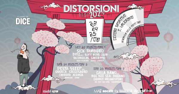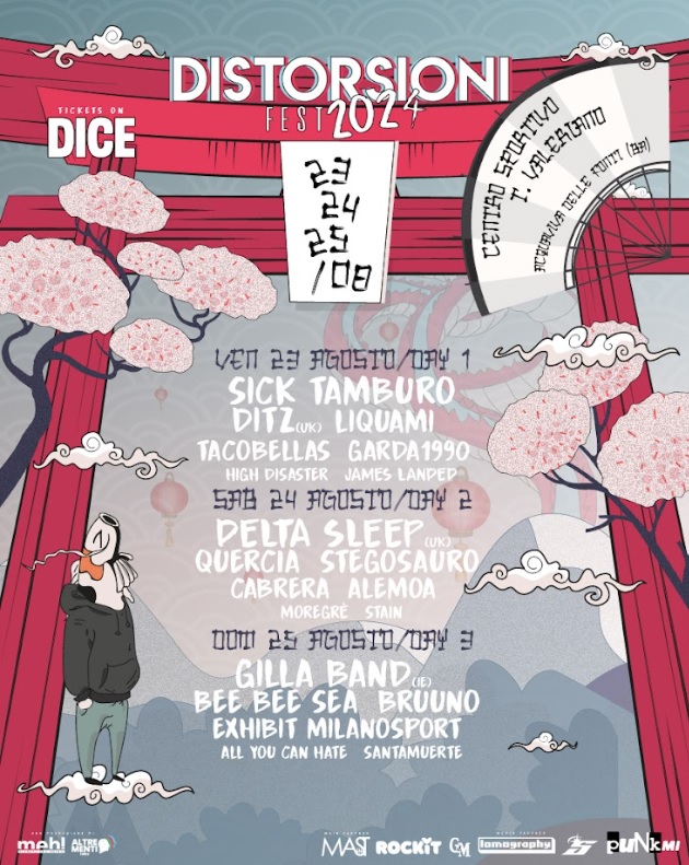 Al loro fianco Distorsioni ospita il meglio della scena underground italiana, caratterizzandosi anche come un festival di scoperta, con tante band emergenti che potrebbero diventare la vostra nuova band preferita. Nella fattispecie, venerdì 23 agosto spazio ai Sick Tamburo di Gian Maria Accusani, band nata dopo l’avventura dei Prozac+, Liquami, la band post-grunge / sludge-pop formata da alcune super-star dell’alternative Italiano come Jacopo Lietti (Fine Before You Came) e Luca Galizia (Generic Animal), e ancora: Tacobellas, Garda1990, High Disaster e James Landed. Sabato 24 agosto spazio anche ai Quercia, band affermatasi negli ultimi anni come uno tra i progetti più credibili nell’universo emocore tricolore, Stegosauro, Alemoa, Cabrera, Moregrè e Stain. Domenica 25 agosto sul palco una tra le band italiane più energiche e divertenti da vedere dal vivo, i Bee Bee Sea, e poi Bruuno, Milanosport, Exhibit, All You Can Hate e Santamuerte.