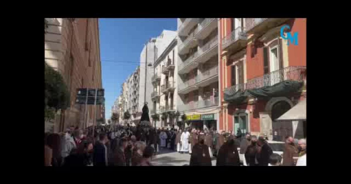 BARI - Stamattina, venerdì antecedente alle Palme, dal Santuario Sant'Antonio di Bari è uscita la statua della Madonna Addolorata. Questo, come da tradizione, è l'incipit dei riti della Settimana Santa barese. E' la sentita solenne processione della «Vergine» in uscita alle ore 10 dalla Chiesa di Sant’Antonio da Padova che nel 2015 è stata elevata dall’allora Arcivescovo di Bari-Bitonto Monsignor Francesco Cacucci al rango di Santuario. La processione, partita dal luogo sacro di piazzetta Sant'Antonio, si snoda lungo le vie della città fermandosi durante il percorso in alcune chiese del centro storico di Bari. L’Addolorata, accompagnata dai fedeli e dalle bande che intonano musiche sacre e marce funebri, se ne va fra la gente che piange, con il fazzoletto bianco fra le mani ed il suo abito nero che rendono ancor più struggente il dolore. Il corteo delle confraternite, con la statua accompagnata dalla banda cittadina di Bitonto, attraversa le strade di Madonnella tra due ali di persone.