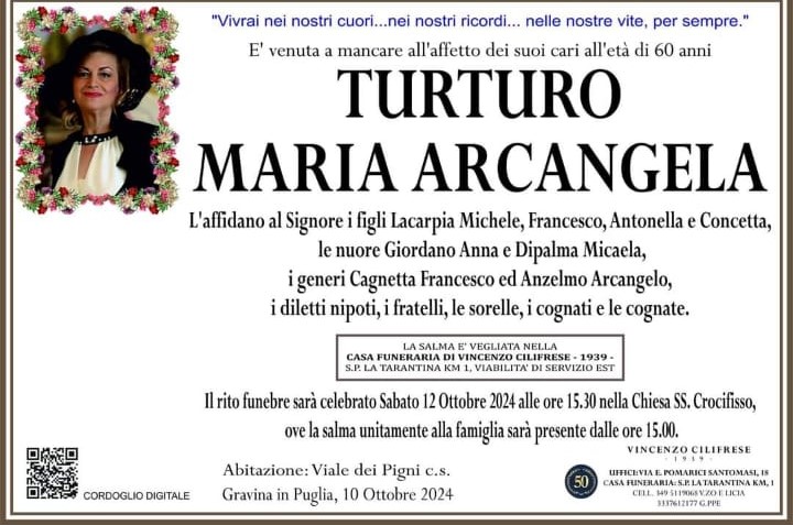 GRAVINA IN PUGLIA - Saranno celebrati domani, sabato 12 ottobre, i funerali di Maria Arcangela Turturo, la donna morta a Gravina in Puglia la notte del 6 ottobre 2024 e per il cui omicidio è stato fermato suo marito, Giuseppe Lacarpia, 65 anni. Le esequie saranno celebrate da monsignor Giuseppe Russo, vescovo di Altamura-Gravina-Acquaviva delle Fonti, nella chiesa SS. Crocifisso, alle 15.30. Davanti l'abitazione della donna in Viale dei Pigni tanti manifesti di cordoglio.