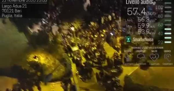 Stanotte i residenti di largo Adua, al quartiere Umbertino di Bari, hanno misurato dal balcone un livello medio di rumore pari a 57 dBA. Lo si vede in un video postato su Facebook da uno dei componenti del comitato, Mauro Gargano.