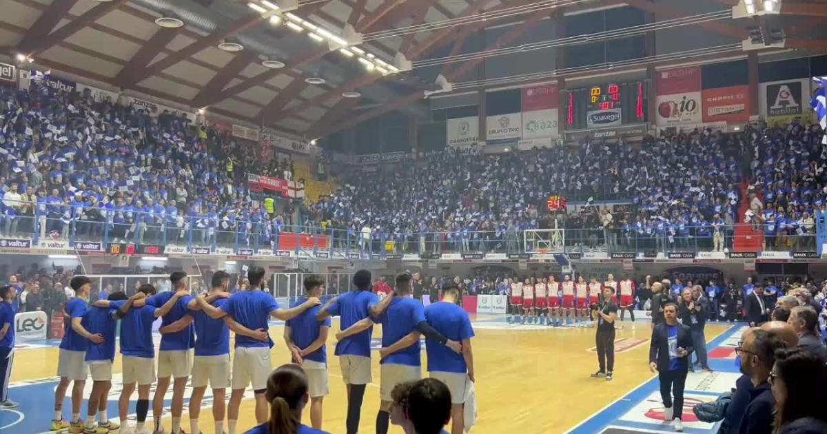 Il title sponsor della società biancoazzurra, Valtur, ha omaggiato tutti i presenti con una t-shirt ‘special edition Playoffs 2025’ di colore blu posta su ogni seggiolino del palasport.