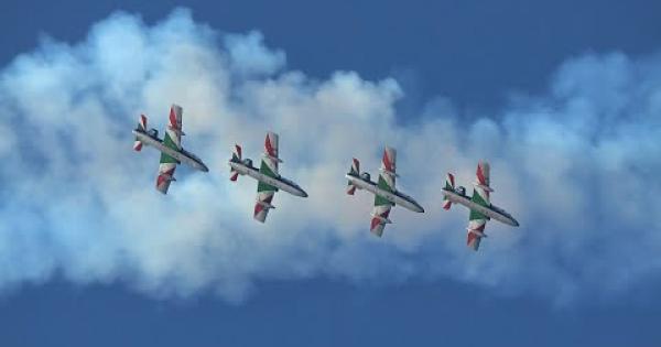 Alle ore 17 hanno sfrecciato con le loro acrobazie mozzafiato, gli Aermacchi MB-339A della Pattuglia Acrobatica Nazionale delle Frecce Tricolori che hanno disegnato nel cielo volute pennellate di verde bianco e rosso. Il 313° Gruppo Addestramento Acrobatico ha proposto per l'occasione il programma acrobatico completo.