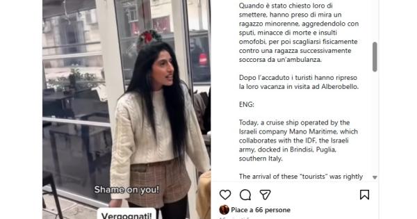 Secondo quanto riferito da alcuni presenti, l’episodio più grave si sarebbe verificato poco dopo, nel centro città (con tanto di video postato su Instagram dalla pagina Xrpuglia) quando un gruppo di crocieristi avrebbe provocato verbalmente alcune persone sedute in un bar, riconoscibili per accessori riportanti la bandiera palestinese. Dalle parole, raccontano i testimoni, si sarebbe poi passati a insulti e minacce.