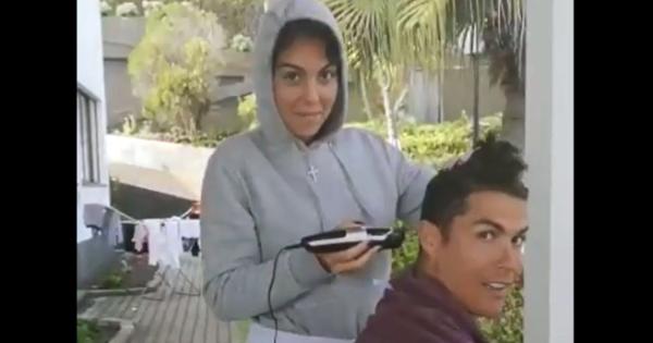 Uno spaccato nella quarantena di Cristiano Ronaldo in Portogallo con la famiglia: la compagna Georgina in versione parrucchiera che, macchinetta in mano, taglia i capelli a CR7 (video Instagram - @georginagio).