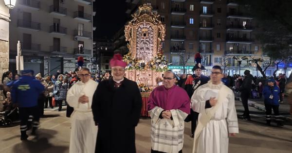 Alle 19.00, il Sacro Tavolo ha sfilato per le vie del centro storico seguendo un itinerario che ha toccato via della Repubblica, via Manzoni con sosta in piazza Villani, via Fuiani, corso Garibaldi, piazza XX Settembre, corso Cairoli, piazza Giordano, corso Vittorio Emanuele II, corso Garibaldi e via Duomo, fino al ritorno in piazza Pericle Felici. Dalla loggia centrale del campanile, l’Arcivescovo Ferretti ha rivolto il suo messaggio alla città, richiamando la comunità alla fede, alla speranza e alla coesione civile.