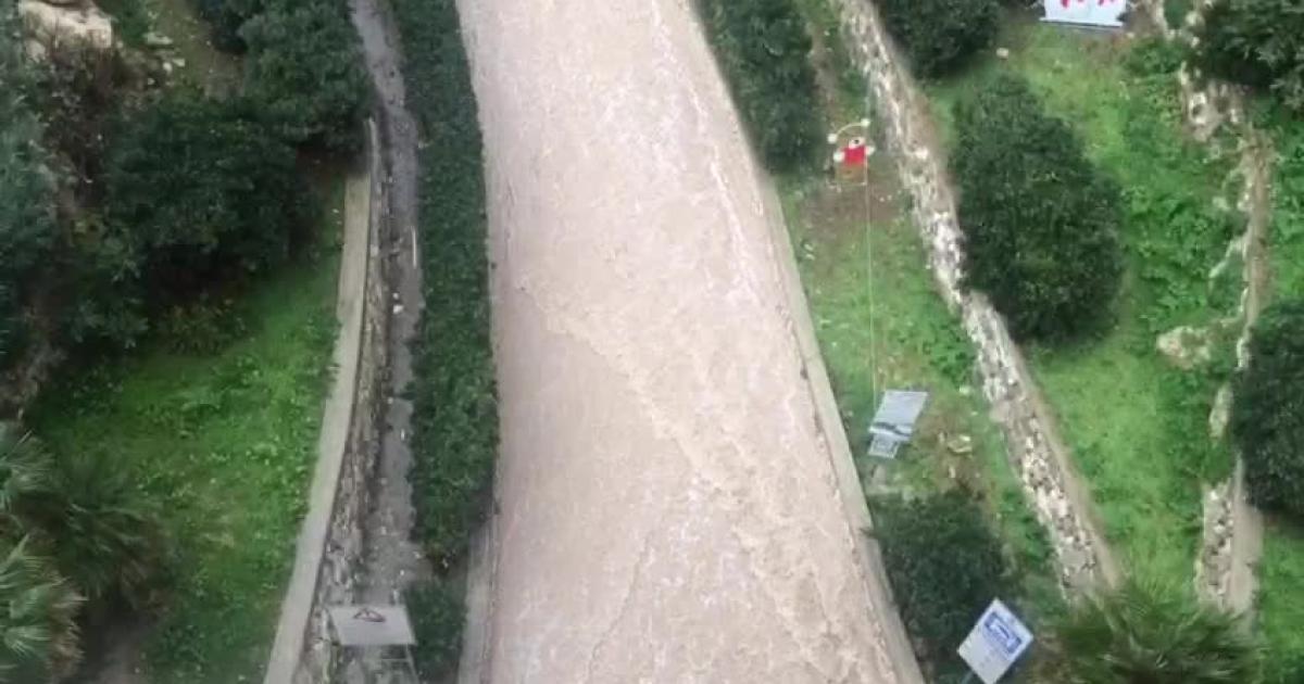 Un torrente d'acqua dopo il maltempo passa pericolosamente vicino alle installazioni luminose