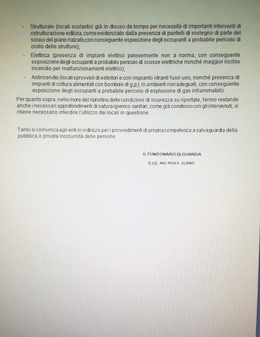 Secondo quanto si legge nella relazione dei vigili del fuoco la struttura è «in disuso già da tempo per importanti interventi di ristrutturazione. Sono presenti una serie di impianti elettrici non a norma con conseguente esposizione degli occupanti a pericolo di scosse e incendio».